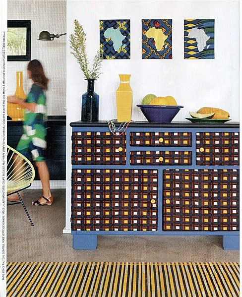 Декорують інтер’єри в африканському стилі, переважно речами привезеними з континенту: дерев’яні статуетки та блюда, глиняний автентичний розписаний посуд, плетені корзини, племені маски, шкури, африканські музикальні інструменти. Тканні картини з традиційним візерунками, пейзажами Саванни та дикими тваринами.